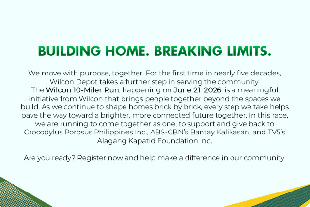 We move with purpose, together. For the first time in nearly five decades, Wilcon Depot takes a further step in serving the community. The Wilcon 10-Miler Run, happening on June 21, 2026, is a meaningful initiative from Wilcon that brings people together beyond the spaces we build. As we continue to shape homes brick by brick, every step we take helps pave the way toward a brighter, more connected future together. In this race, we are running to come together as one, to support and give back to Crocodylus Porosus Philippines Inc., ABS-CBN’s Bantay Kalikasan, and TV5’s Alagang Kapatid Foundation Inc.